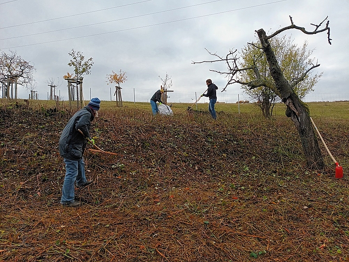 Gemeinsam werden das Mähgut abgeräumt, Gehölze zurückgeschnitten und große Äste an den Rand der Fläche gebracht. Zwischendurch gibt es spannende Infos zur Pflege von Streuobstwiesen, zur Schafbeweidung und zur Bedeutung dieser historischen Kulturlandschaft – direkt vom Pächter und dem RegioCrowd-Team.