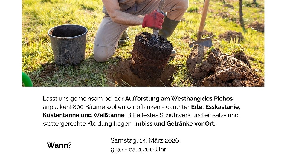 Lasst uns gemeinsam bei der Aufforstung am Westhang des Pichos anpacken! 800 Bäume wollen wir pflanzen - darunter Erle, Esskastanie, Küstentanne und Weißtanne. Bitte festes Schuhwerk und einsatz- und wettergerechte Kleidung tragen. Imbiss und Getränke vor Ort.