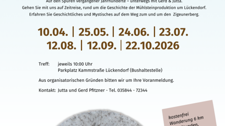 Weitere Mühlstein-Wanderungen gibt es am 25. Mai, 24. Juni, 23. Juli, 12. August, 12. September und am 22. Oktober 2026 jeweils ab 10.00 Uhr