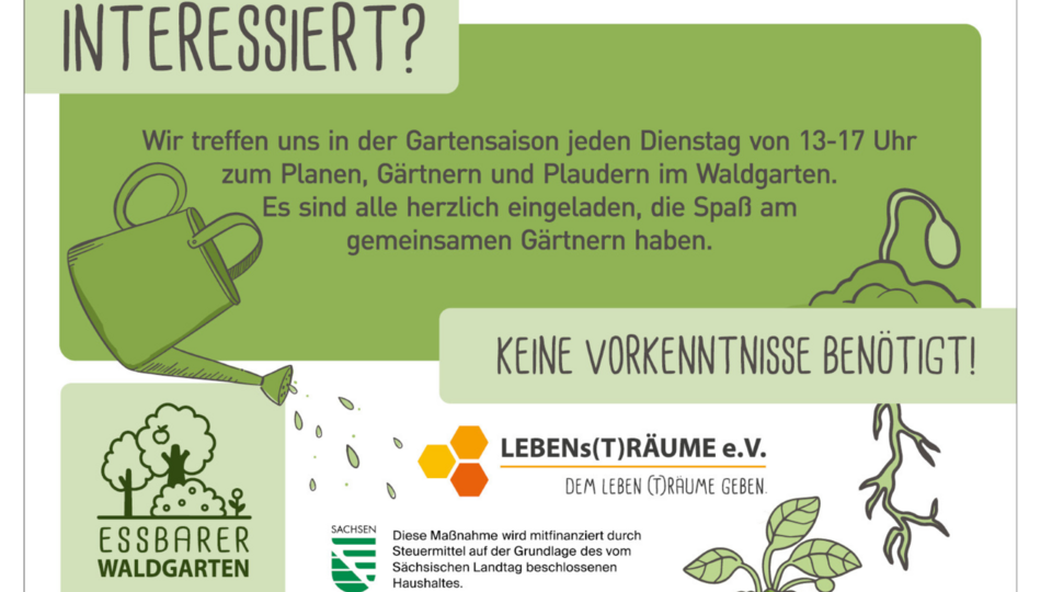 Auf dem Gelände einer ehemaligen Textilfabrik erprobt der Verein LEBENs(T)RÄUME Renaturierung unter anderem durch den Aufbau eines essbaren Waldgartens. Dazu können sie während der Gartensaison, jeden Dienstag von 13-17 Uhr immer wieder Unterstützung gebrauchen.