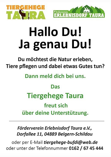 Das Tiergehege wurde im Mai 2004 offiziell eingeweiht. Es gehört zu einem umfangreichen Projekt zur Entstehung attraktiver Tourismusbereiche im Erlebnisdorf Taura. Die Liebe zum Tier steht im Tiergehege Taura im Vordergrund. Seit 2004 kann man eine Vielzahl von Tieren besichtigen. Wir pflegen Rotwild, verschiedene Arten von Ziegen, Hasen, Schafen, Meerschweinchen und Zwergpferden. Aber auch zwei Alpakas und einen Esel findet man auf unserer Wiese. Für die tägliche Arbeit suchen wir dringend Unterstützung in unserem Tiergehege.