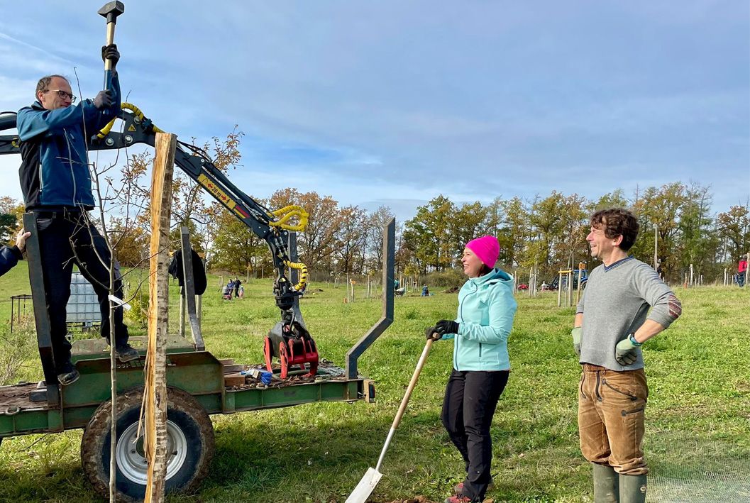 Die Baufirma Geissler hatte das Pflanzen durch das Ausbaggern der Pflanzlöcher erleichtert. BI –Mitglied Jonas Hommel bereitete die in die Erde einzubringenden Drahtkörbe zum Schutz vor Beschädigung der Bäume durch Wühlmäuse und Akazienholzpflanzpfähle vor. Bei schönem Wetter konnte die Pflanzaktion gegen Mittag zum Abschluss gebracht werden.